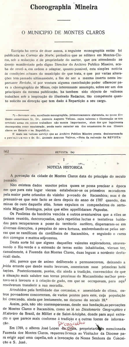 A mais antiga notícia em formato acadêmico que se tem de Montes Claros foi divulgada na capital Ouro Preto pela Revista do Archivo Público Mineiro, em outubro e dezembro de 1897. Doze anos antes, havia sido publicada em M. Claros, pelo jornal Correio do Norte, "de propriedade do autor". É um documento raro hoje em dia, saído da pena do depois desembargador Dr. Antônio Augusto Veloso, reconhecido e homenageado como o pai da imprensa de Montes Claros.