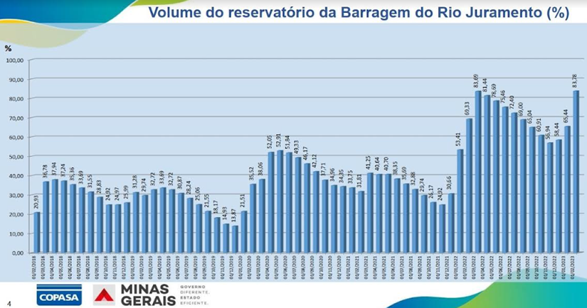 A BARRAGEM DE JURAMENTO termina o primeiro mês do ano 2023 conta com 83,73% da sua capacidade – faltando 01,64 metro para transbordar.