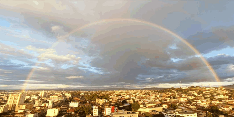 Arco-íris (vai) da Colina do Dona Germana à Catedral, e ilumina a tarde de Montes Claros (foto).