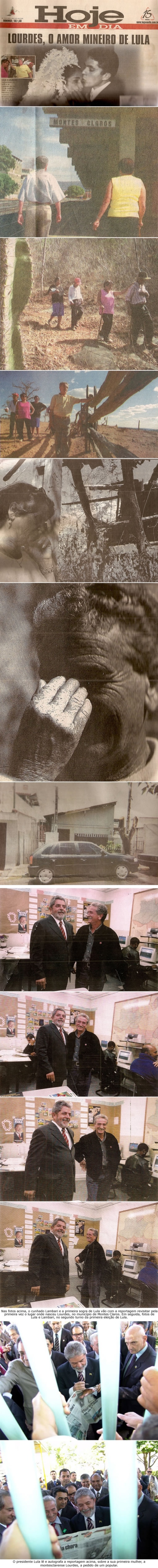 “O senhor é o senhor Luiz?”, perguntou o médico. “Sou”, respondeu o rapaz. O senhor precisa ser forte para ouvir o que vou lhe dizer. “Seu filho nasceu morto”, continuou o doutor. “É preciso ser mais forte ainda, porque sua mulher também morreu”. Assim Luiz Inácio Lula da Silva recebeu a notícia da morte de Maria de Lourdes da Silva, sua primeira mulher. Era manhã de segunda-feira, 7 de junho de 1971. Lourdes, nascida na zona rural de Montes Claros, foi, como seu marido, retirante da mesma seca de 1952. Unidos pelo destino, se conheceram em um bairro pobre de São Paulo, onde eram vizinhos. Em reportagem especial dos repórteres Paulo Narciso e Leo Drumond, o HOJE EM DIA refez esta parte da biografia do presidente, percorrendo, ao lado de sua primeira sogra, dona Hermínia, e do cunhado e amigo de juventude, Jacinto Ribeiro, o Lambari, a vila onde nasceu Lourdes, no Norte de Minas. Páginas 7 a 11, Especial.